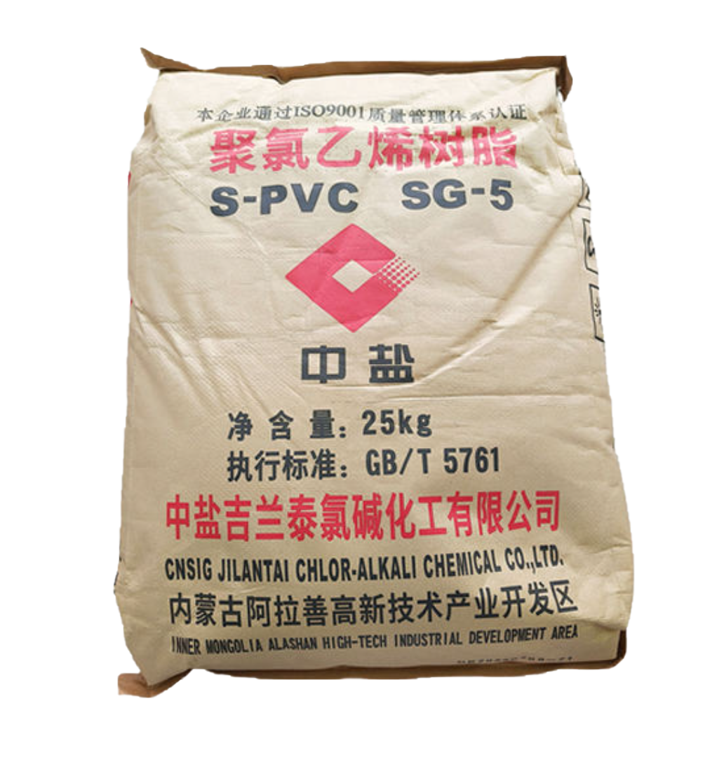 Product Name: Polyvinyl chloride resin Model: S-PVC SG-5 Net weight: 25kg Execution standard: GB/T5761 CNSIG JILANTAI CHLOR-ALKALI CHEMICALCO INNER MONGOL IA ALASHAN HICH-TECH INDUSTRIAL DEVELOPMENT AREA